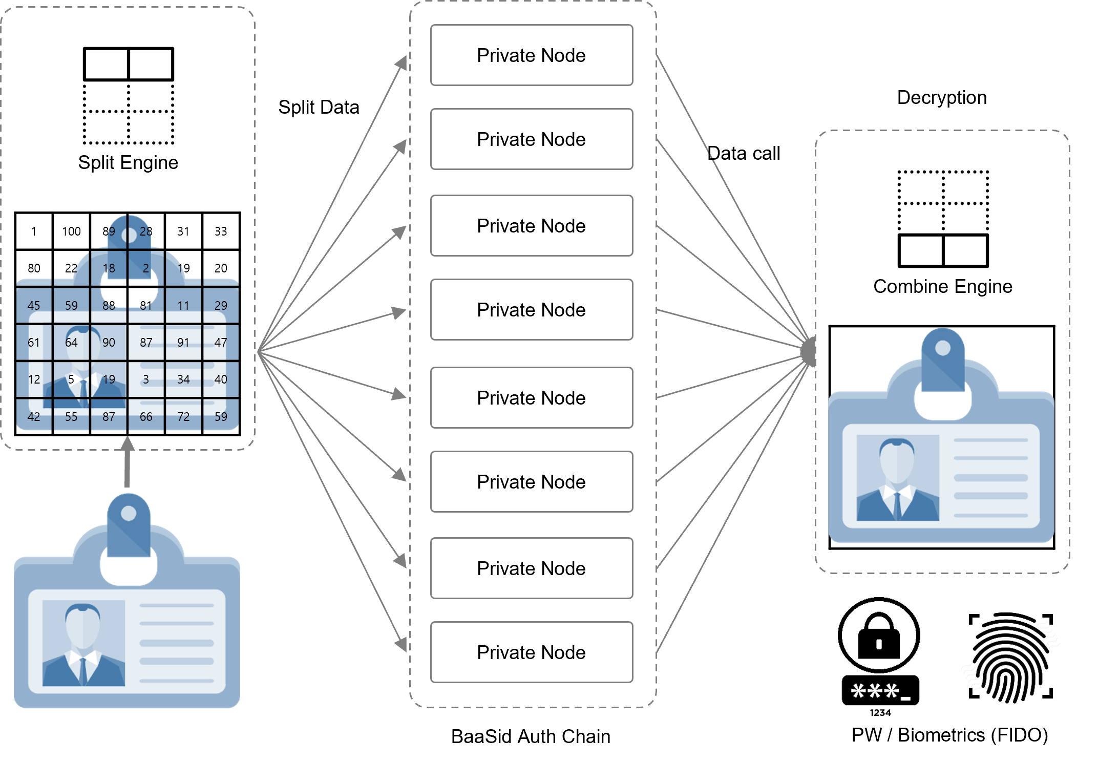 **BaaSid**’s Decentralized Storage does not leave original data by separating, distributing, and partially redundantly storing fragment data of all the original pieces carved out through Split Engine into each storage. This means that not all storage stores original data but only individual pieces of data, which in itself stores only useless garbage data. In addition, De-Storage will build various business models in the process of separating such content and combining fragmented data. Copyright protection model for content data combination / Content verification model for content data combination / Online De-Storage Model for Cold Storage Replacement